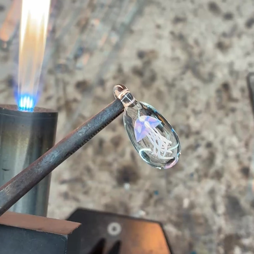 A tiny ocean world you can wear. This handcrafted glass jellyfish pendant features a soft pink slyme body with delicate white tentacles suspended inside crystal-clear glass. Made in California by Mak Glass, each piece is one of an kind and crafted with care.